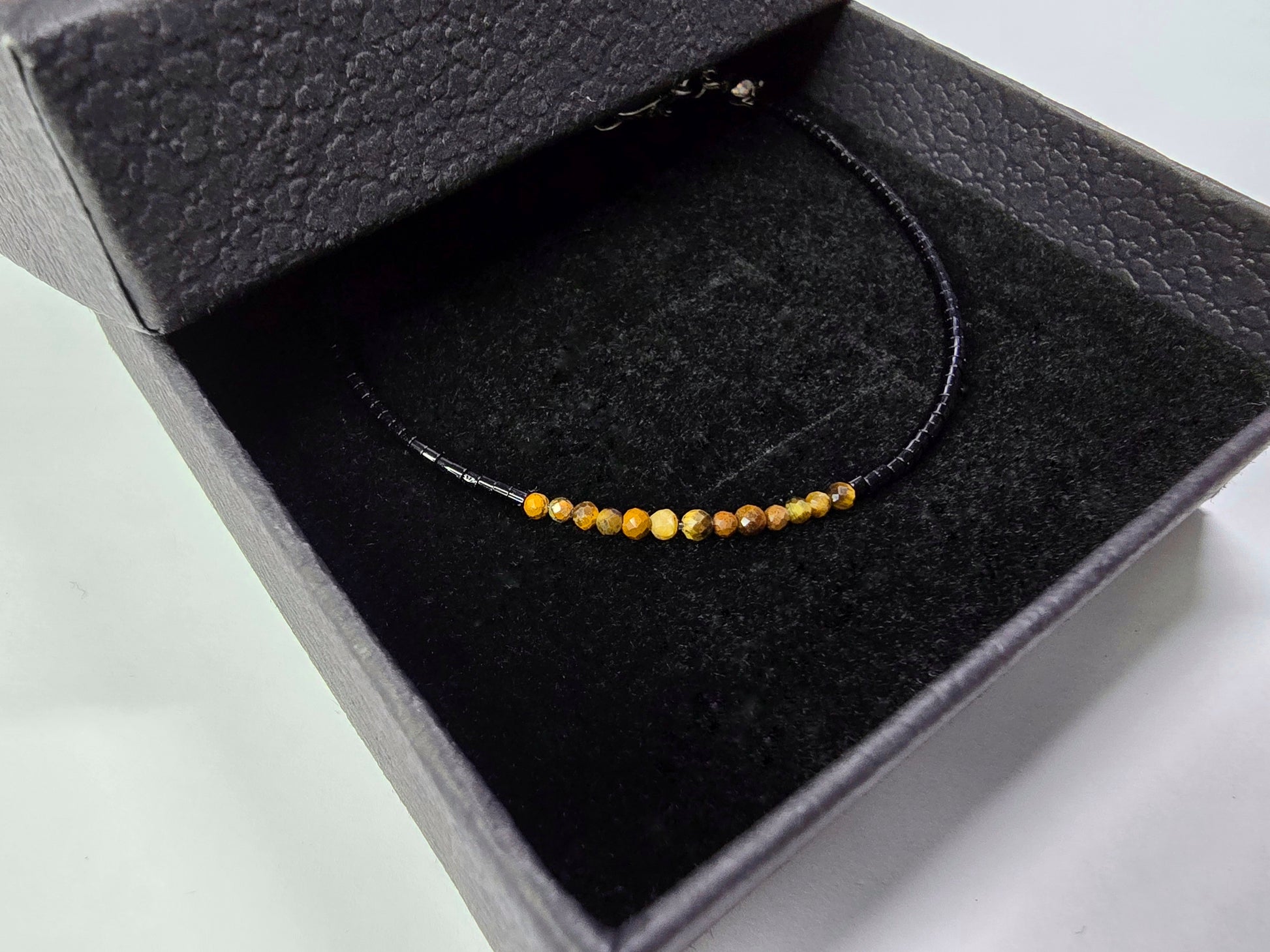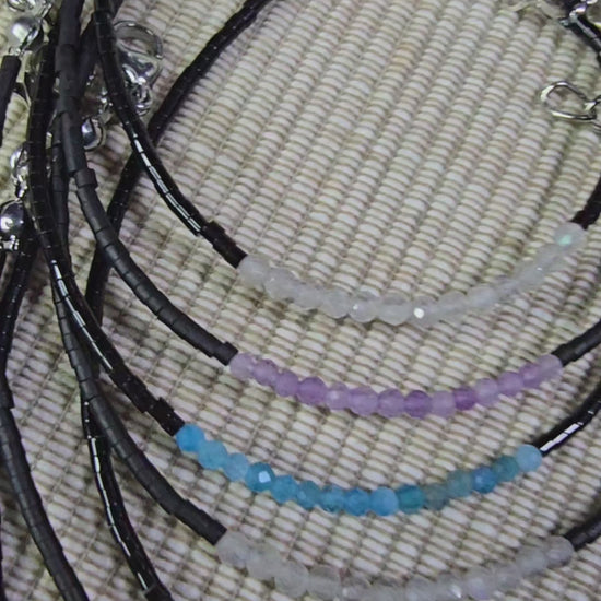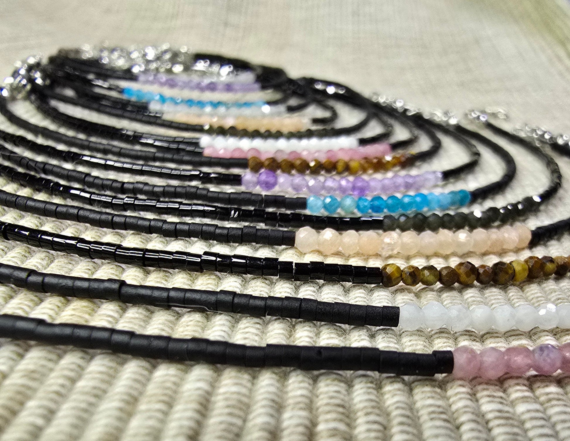 Die Fine-Design Linie hier in markantem Schwarz, kombiniert mit deinem Kraftstein. Die 2 mm feinen Perlen verleihen eine wunderschöne Zartheit, während die facettierten Steine in Kombination mit Schwarz ein echtes Statement setzen.