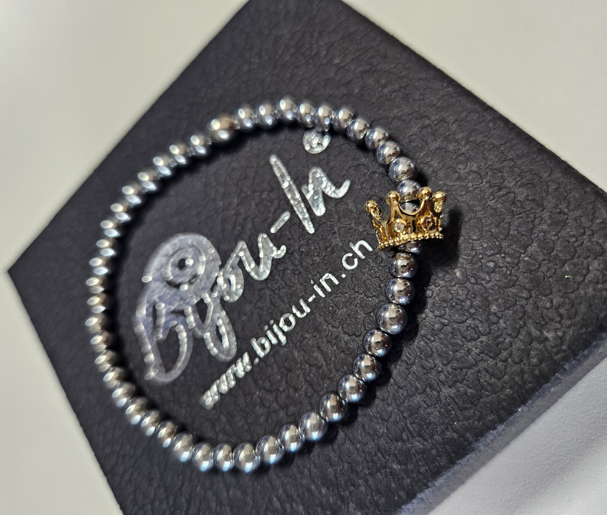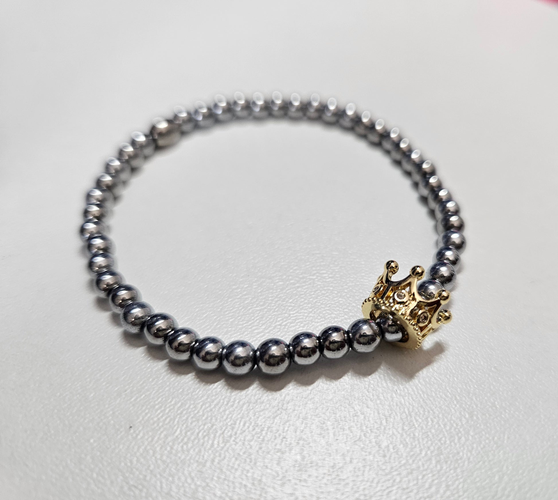 Feine Armkette aus 4mm hellem Hämatit Stein. Das Schmuckstück liegt super schön und dezent am Handgelenk. Gekrönt wird sie durch die bewegliche Krone in Gold, die mit Zirkonen besetzt ist.