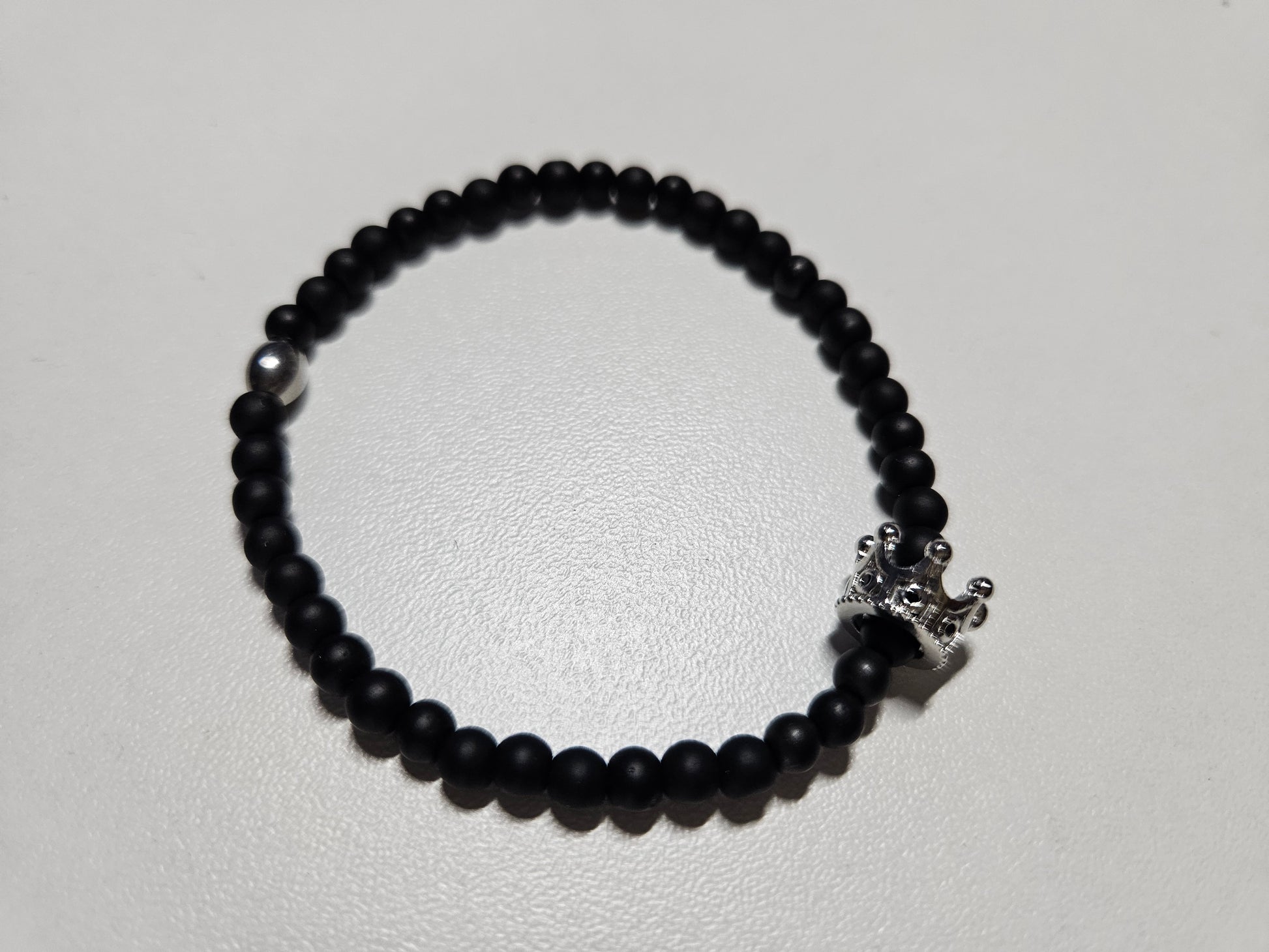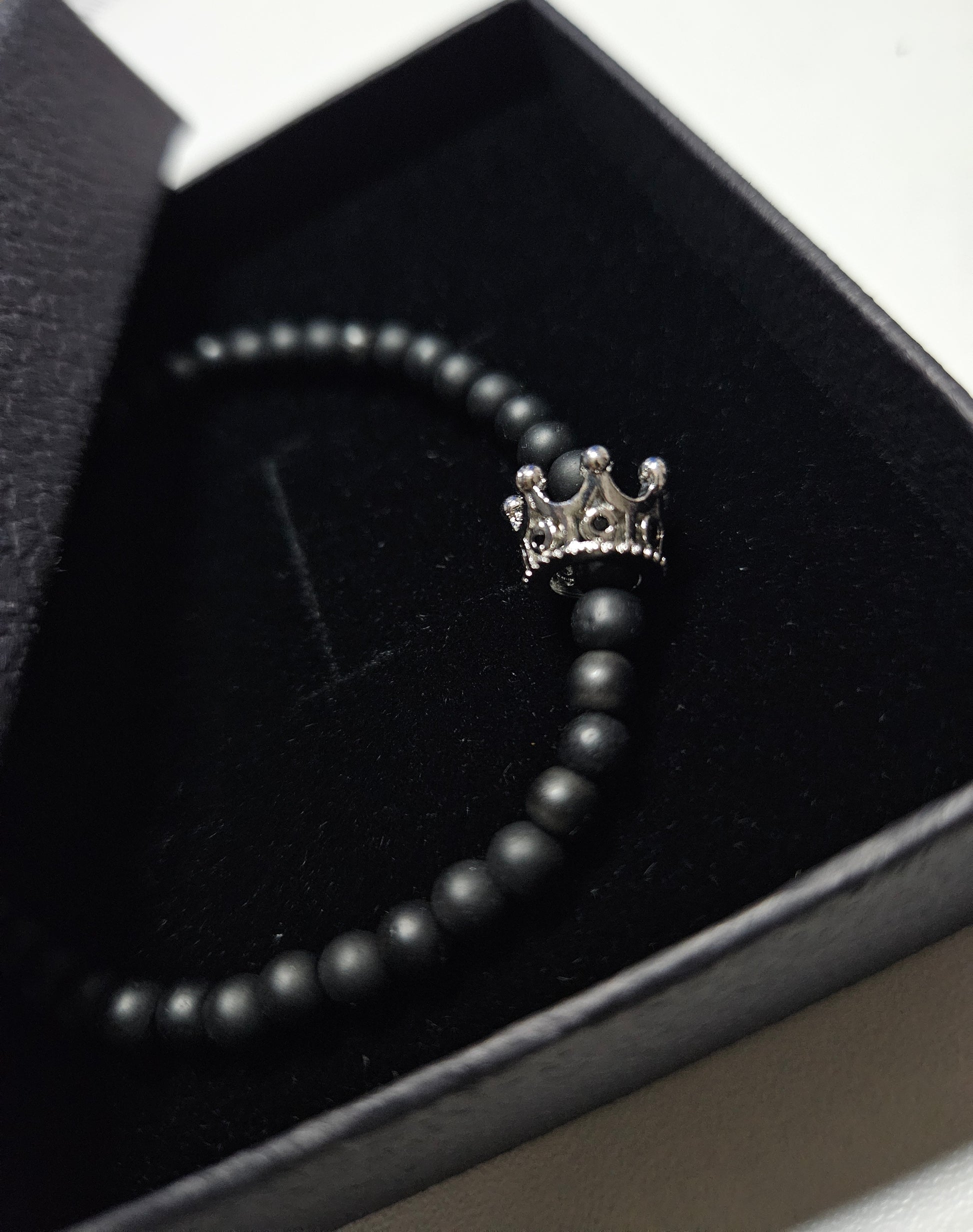 Schwarz/Silber Variante aus mattem Onyx und der silbrigen Krone die mit schwarzen Zirkonen besetzt ist.
