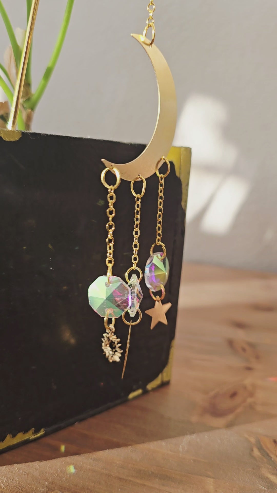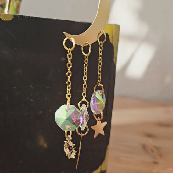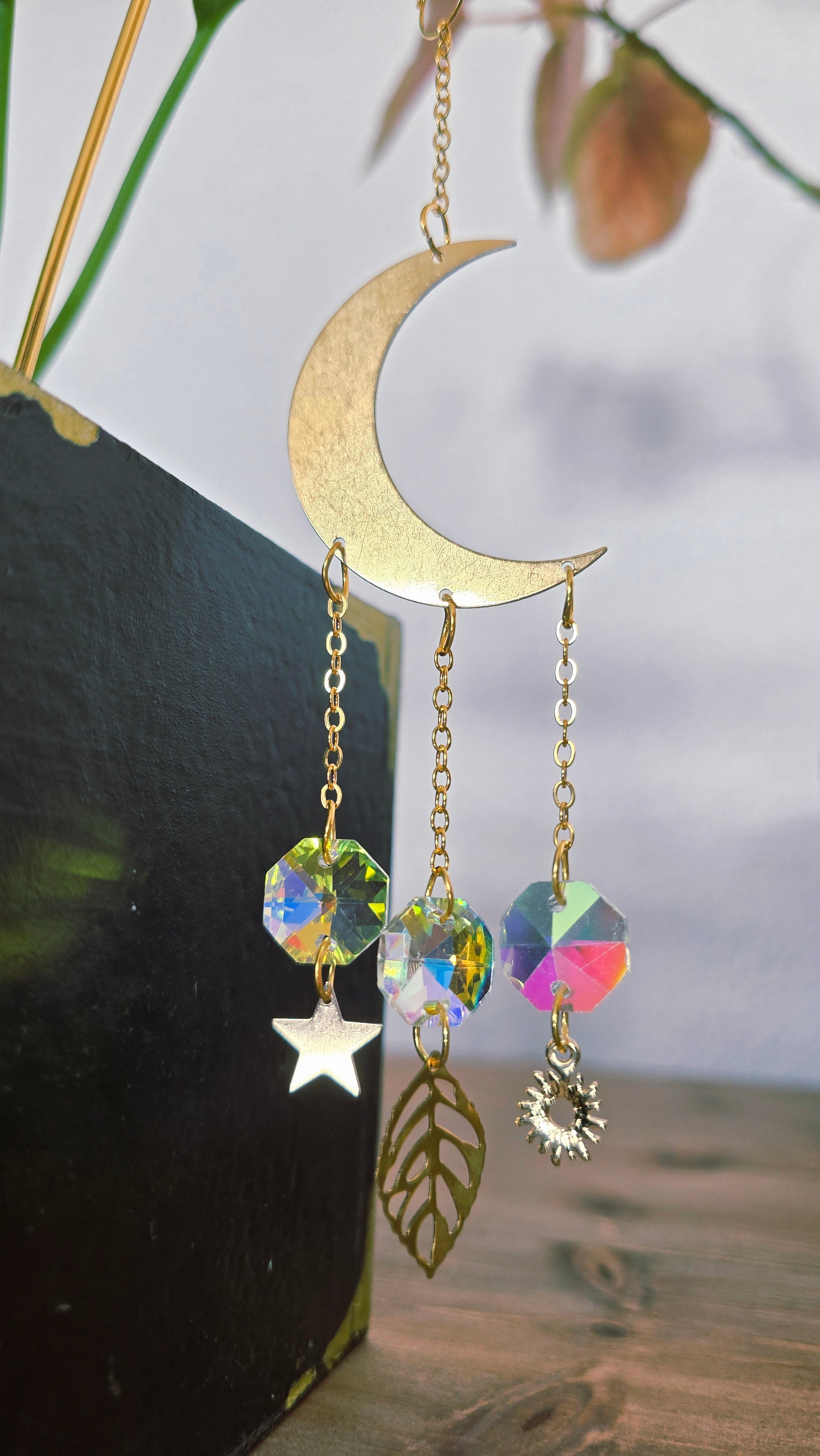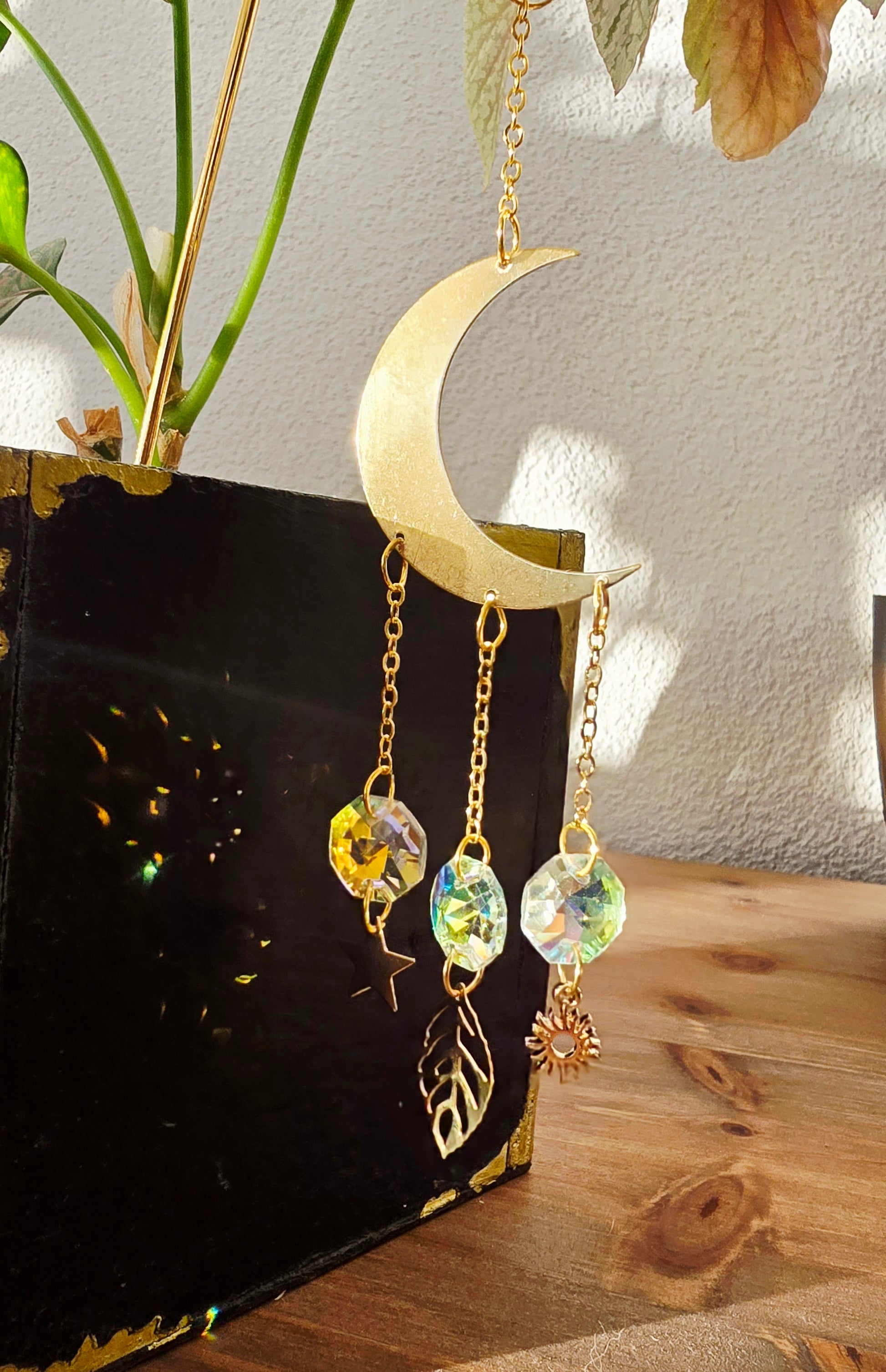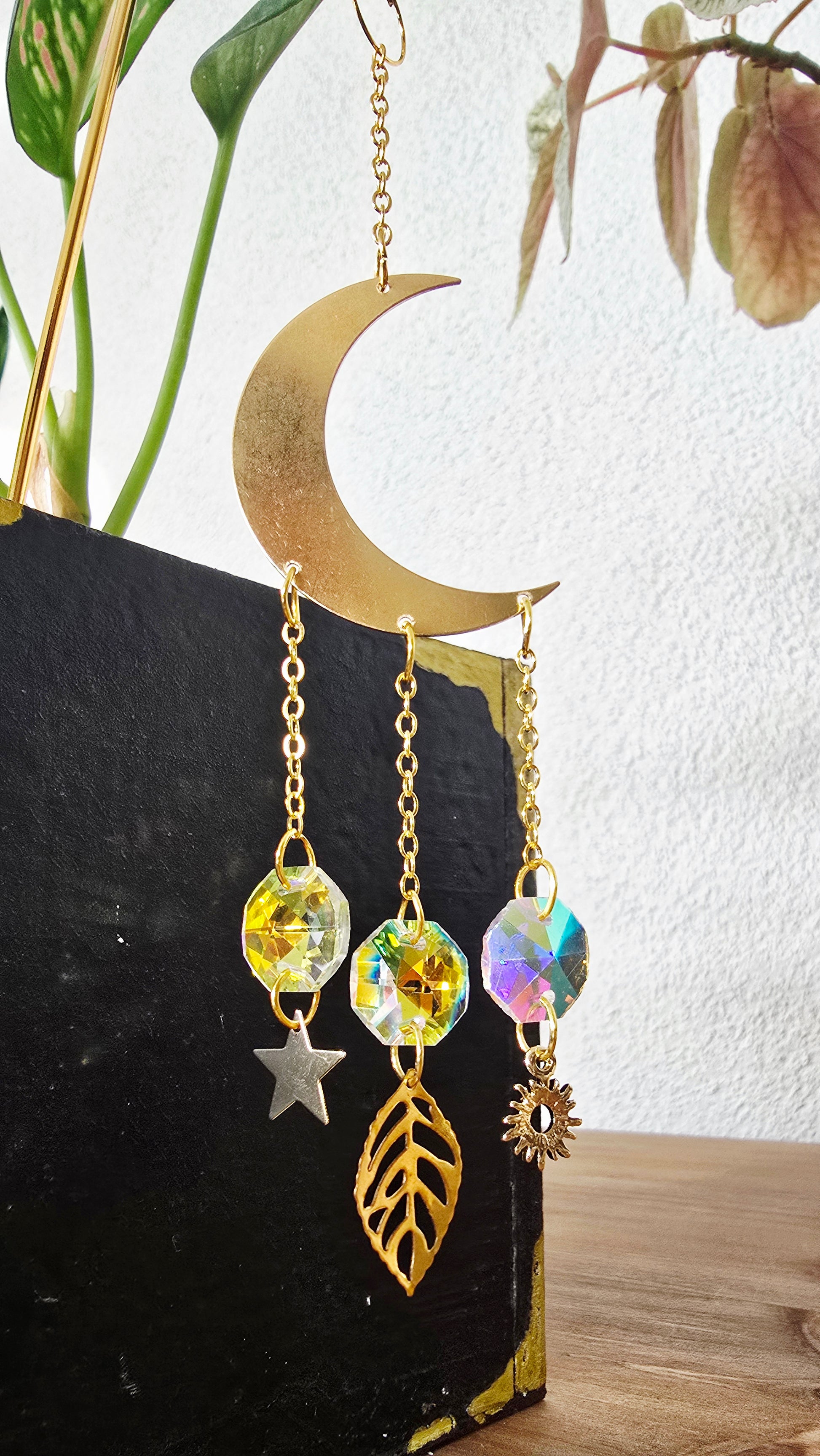Dieser filigrane Sonnenfänger verbindet die Symbole der Natur in einem kleinen Lichtzauber: Die Mondsichel steht für Wandel und Neubeginn, das Blatt für Wachstum und Lebenskraft, die Sonne für Wärme und Energie, der Stern für Hoffnung und innere Führung. Trifft Licht auf die Kristalle, entstehen tanzende Funken, die deine Pflanzen und den Raum in ein sanftes, verträumtes Leuchten hüllen - wie ein stiller Gruß von Himmel und Erde.