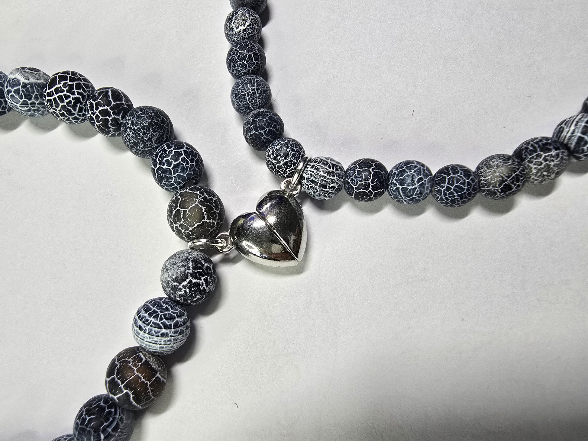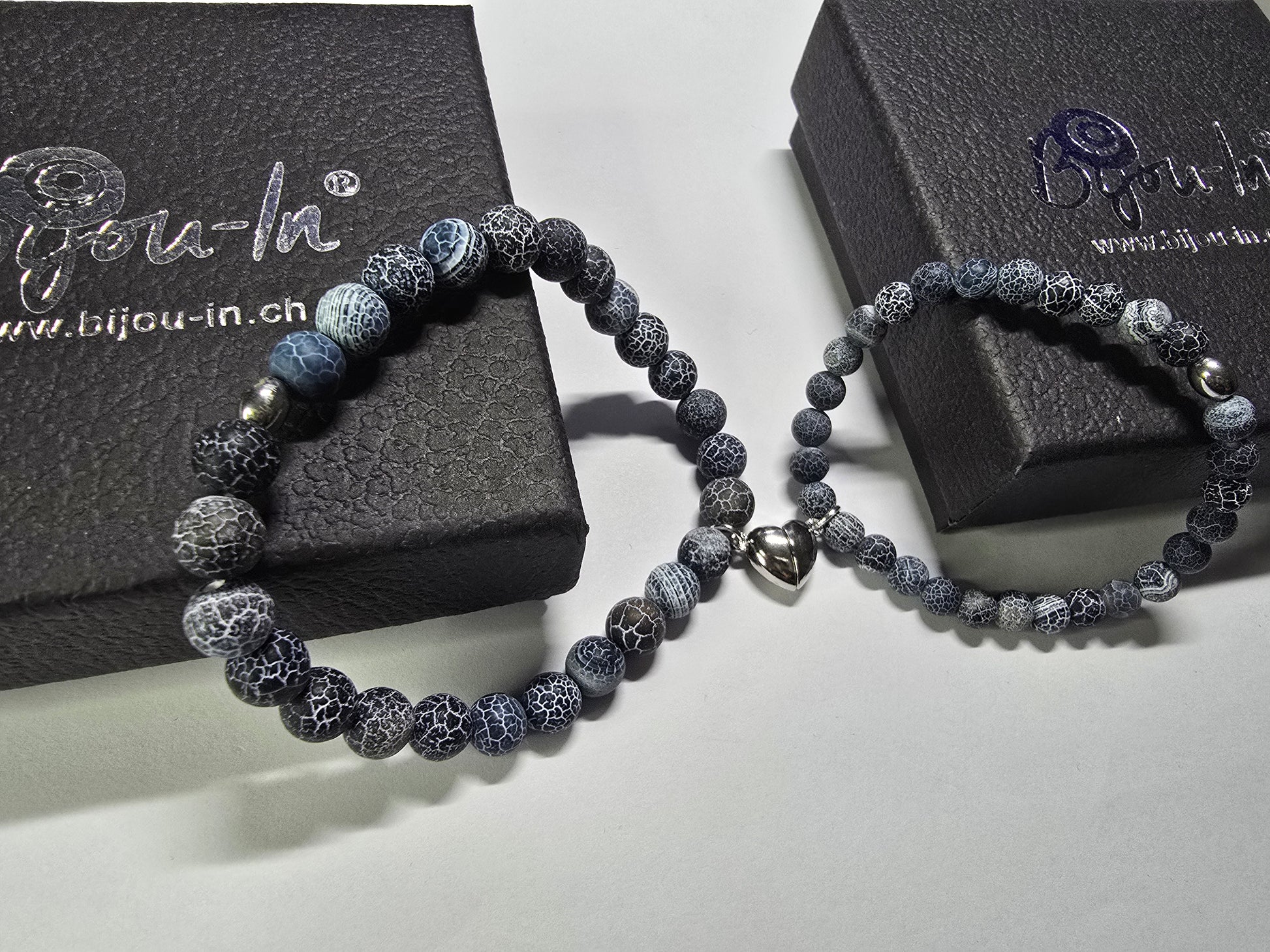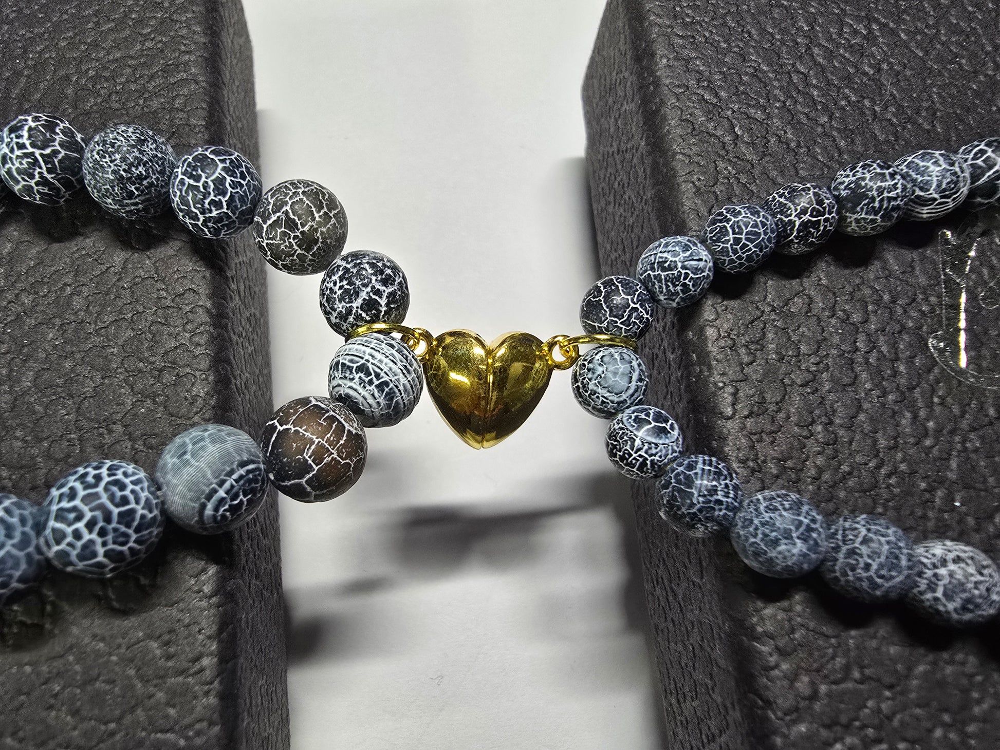 Diese spezielle Variante des grauen Achat ist ein absoluter Blickfang für beide. Durch die auffällige Struktur und die einmalige Farbkombination der einzelnen Steine, sorgt dieses Schmuckstück ohne viel Zubehör für einen stylishen Auftritt. Gekrönt wird sie nur durch eine magnetische Herzhälfte das eure Verbindung symbolisiert ♡