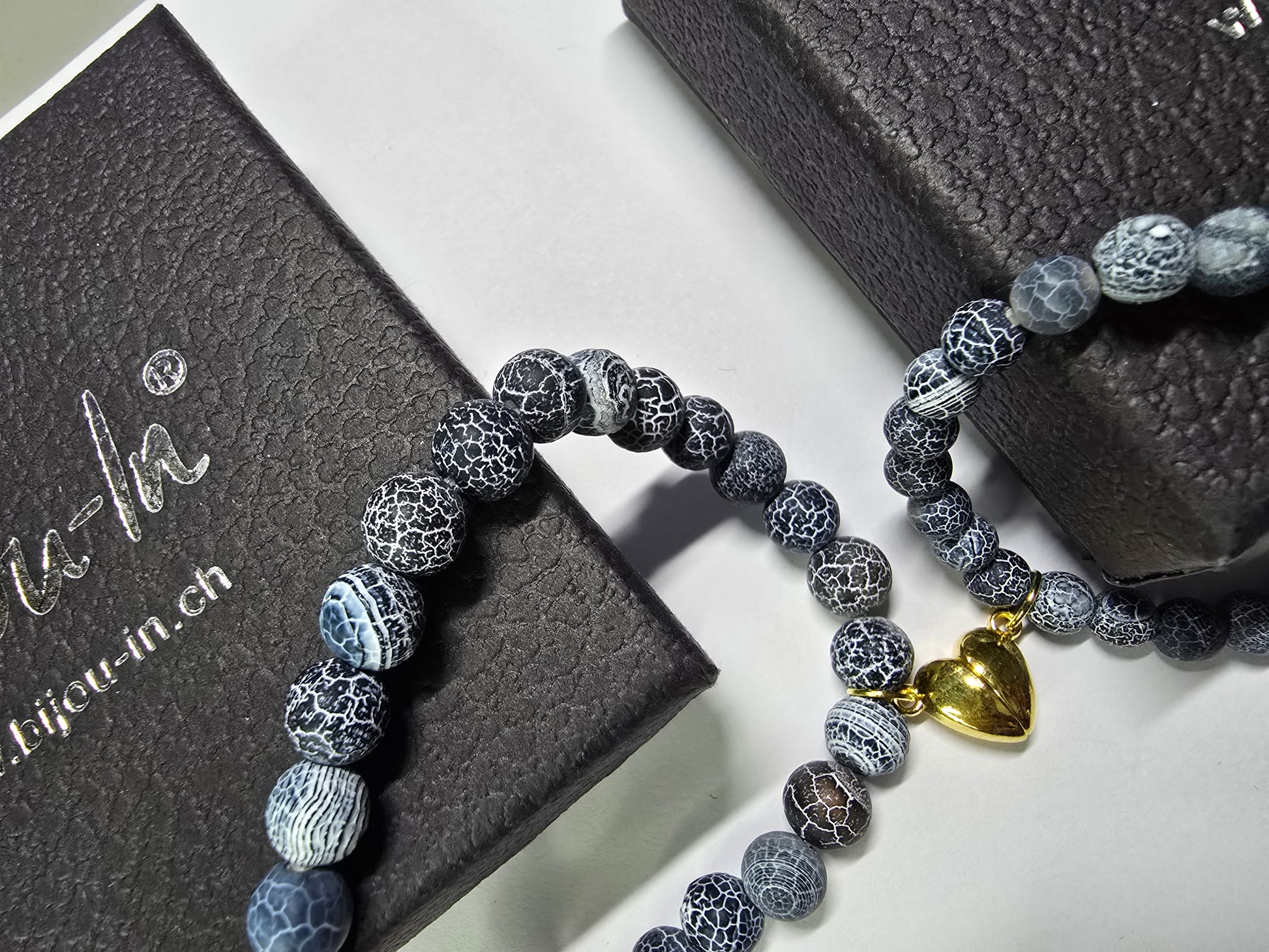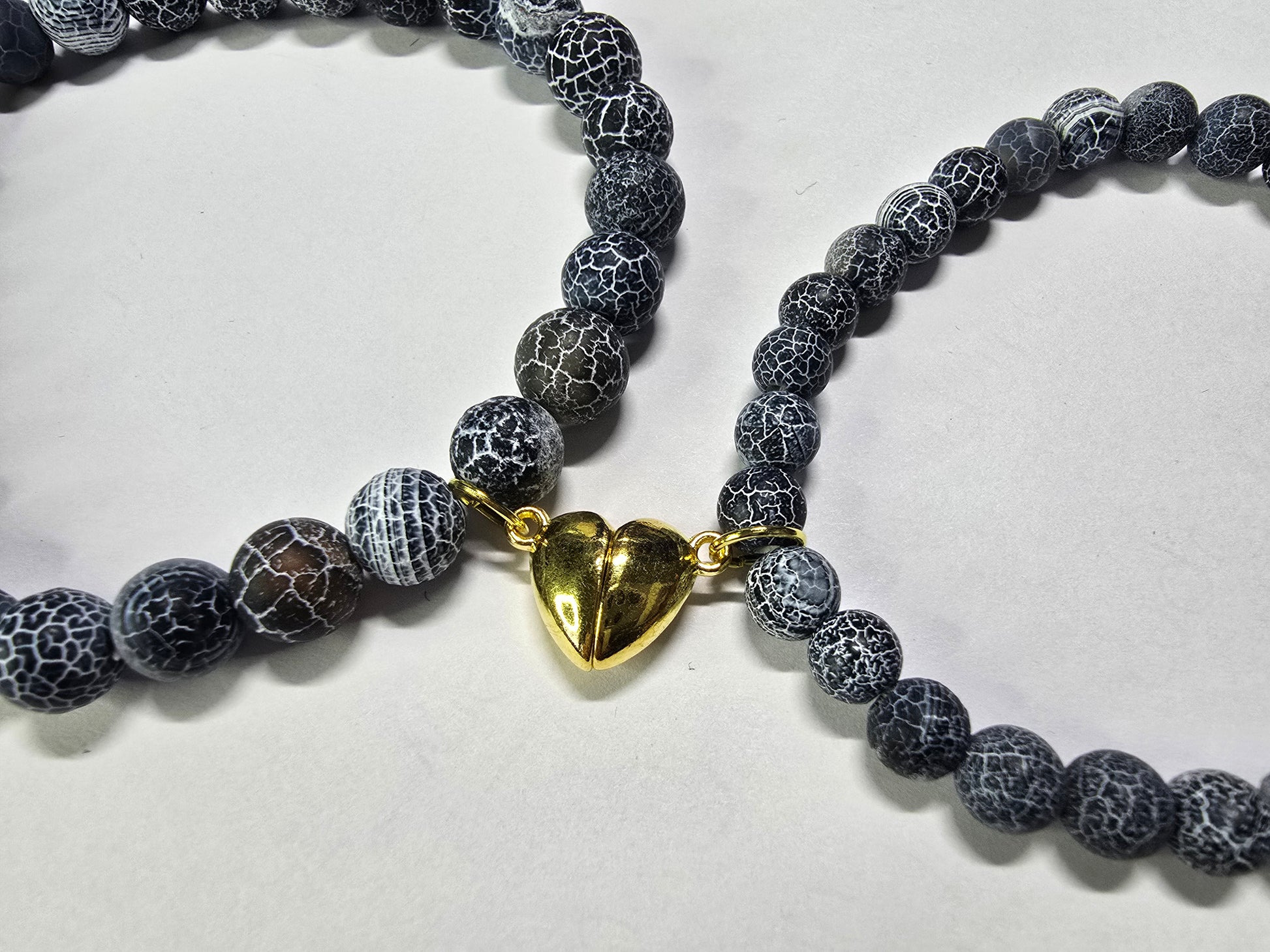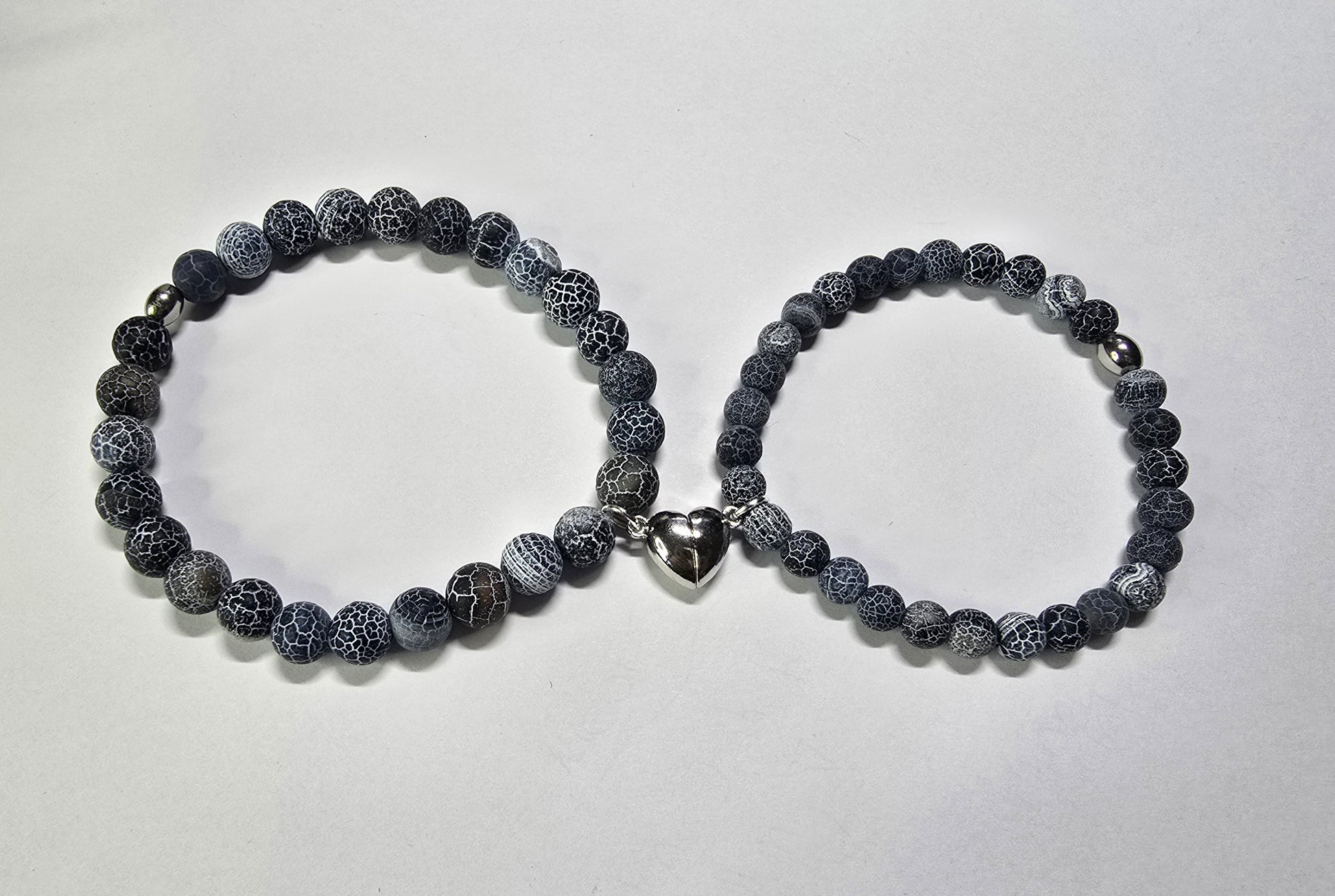 Diese spezielle Variante des grauen Achat ist ein absoluter Blickfang für beide. Durch die auffällige Struktur und die einmalige Farbkombination der einzelnen Steine, sorgt dieses Schmuckstück ohne viel Zubehör für einen stylishen Auftritt. Gekrönt wird sie nur durch eine magnetische Herzhälfte das eure Verbindung symbolisiert ♡