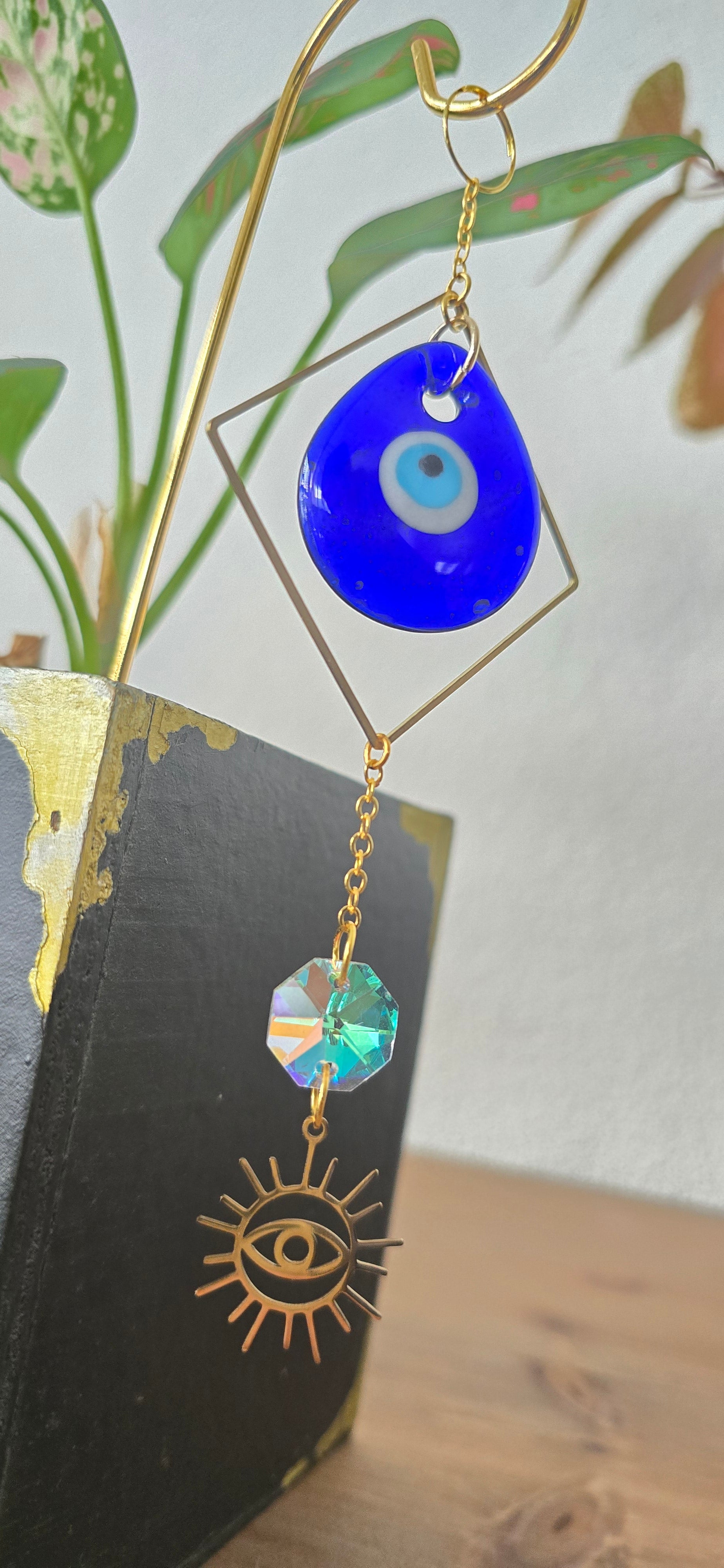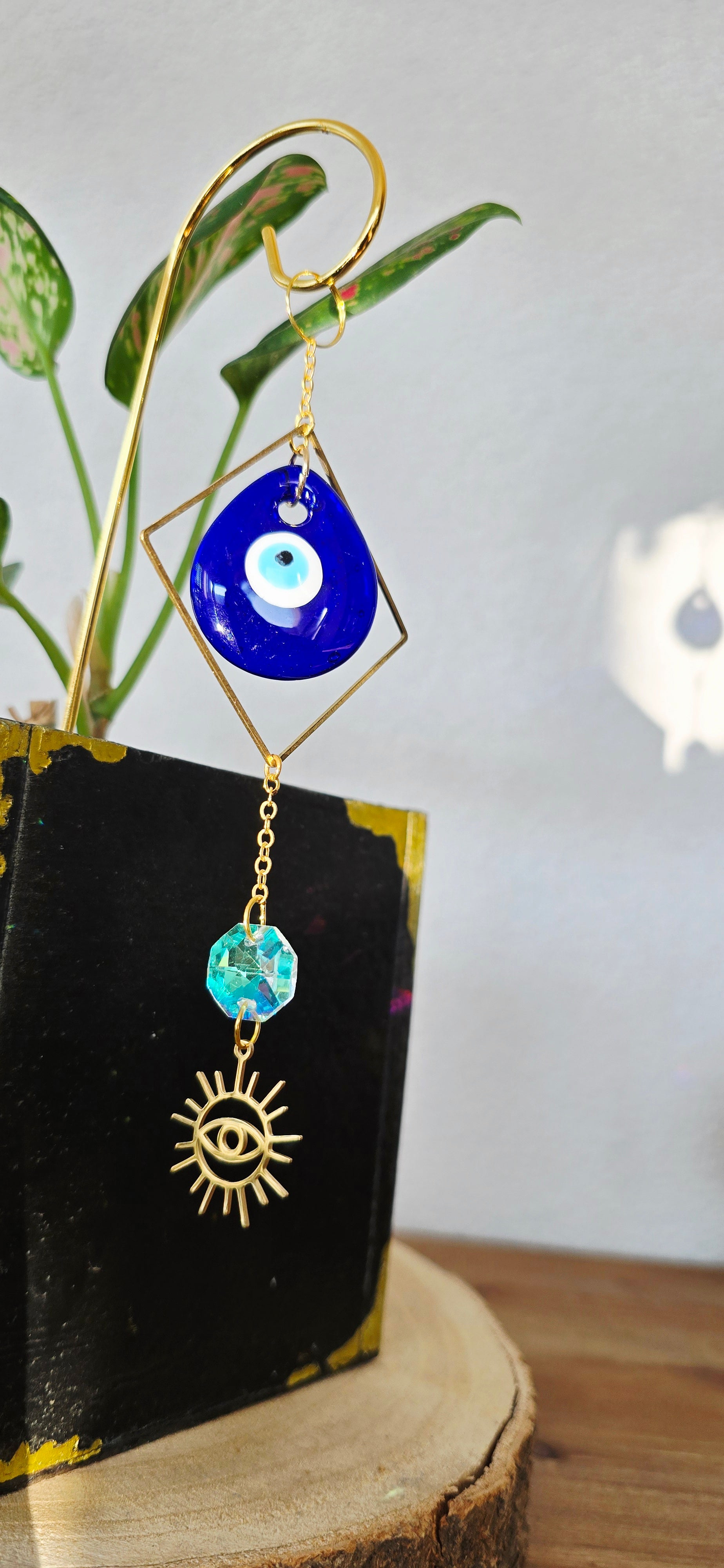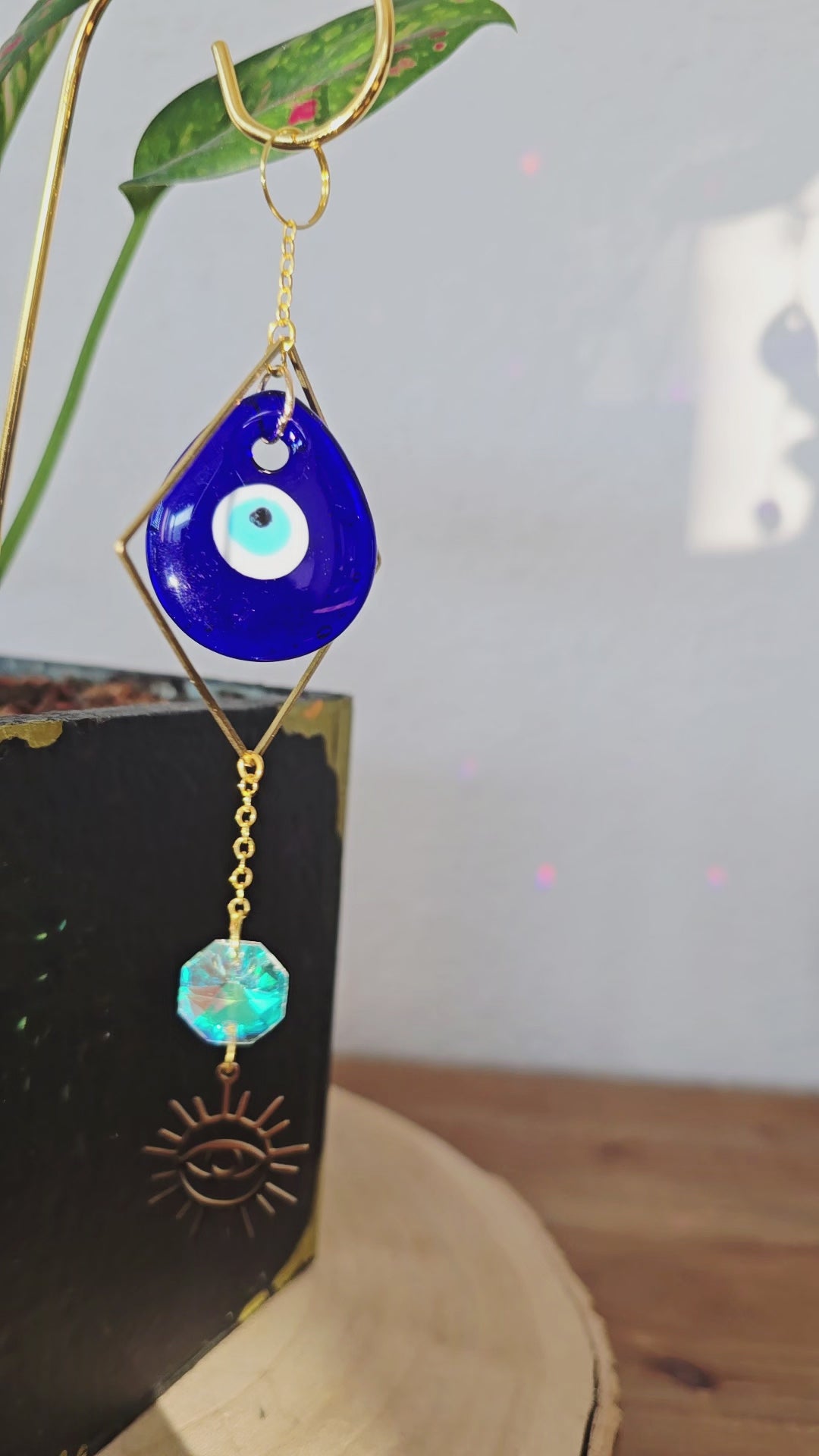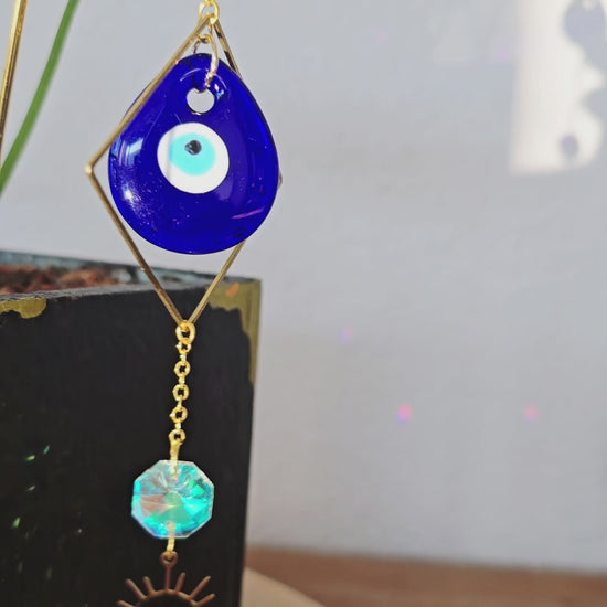 Das goldene Sonnensymbol steht für Lebensenergie, Wachstum und Wärme, während das tiefblaue Nazar-Auge schützend wirkt und negative Energien fernhalten soll. Eine besondere Dekoration, die Schönheit, Symbolik und positive Ausstrahlung vereint.