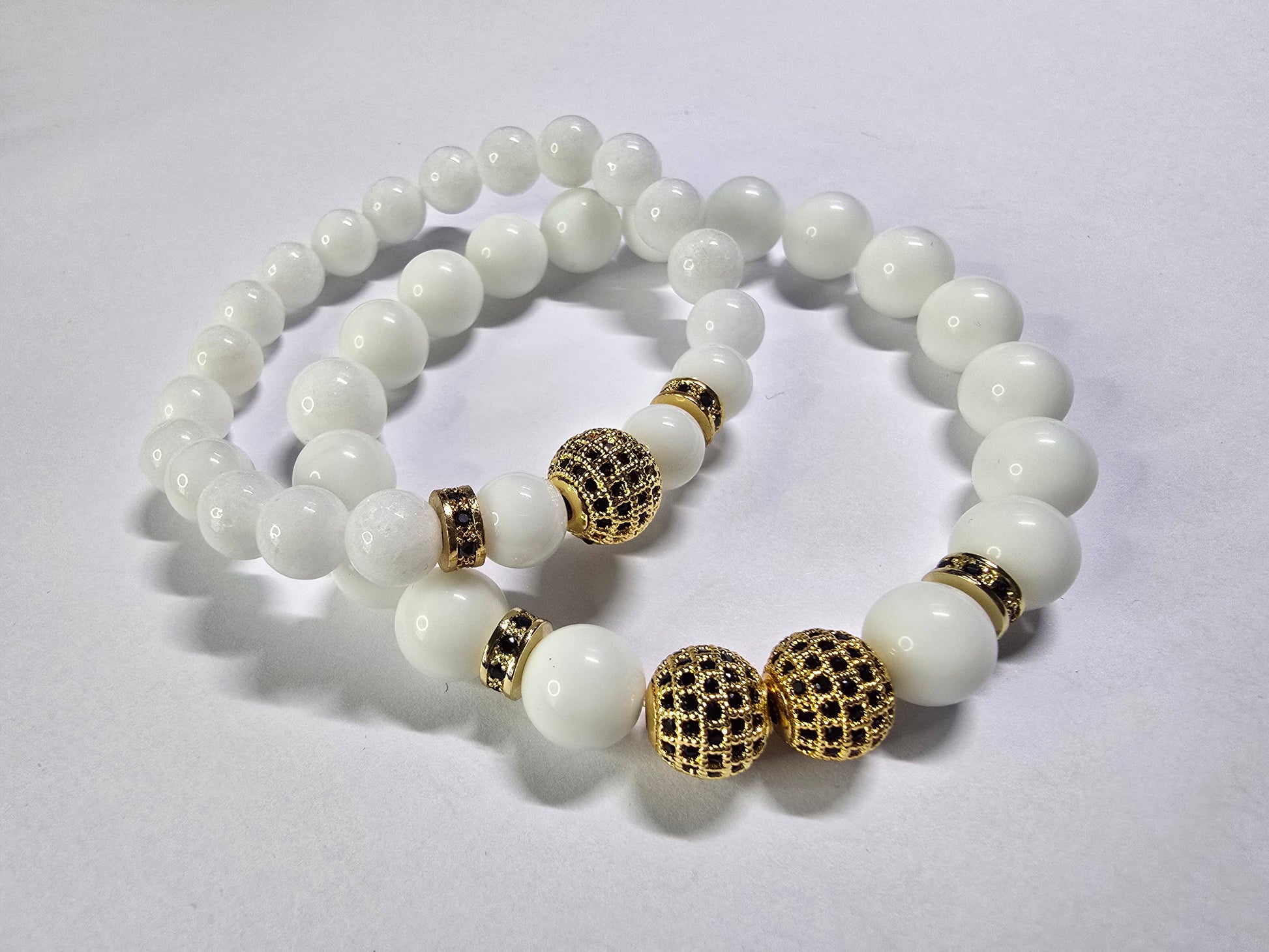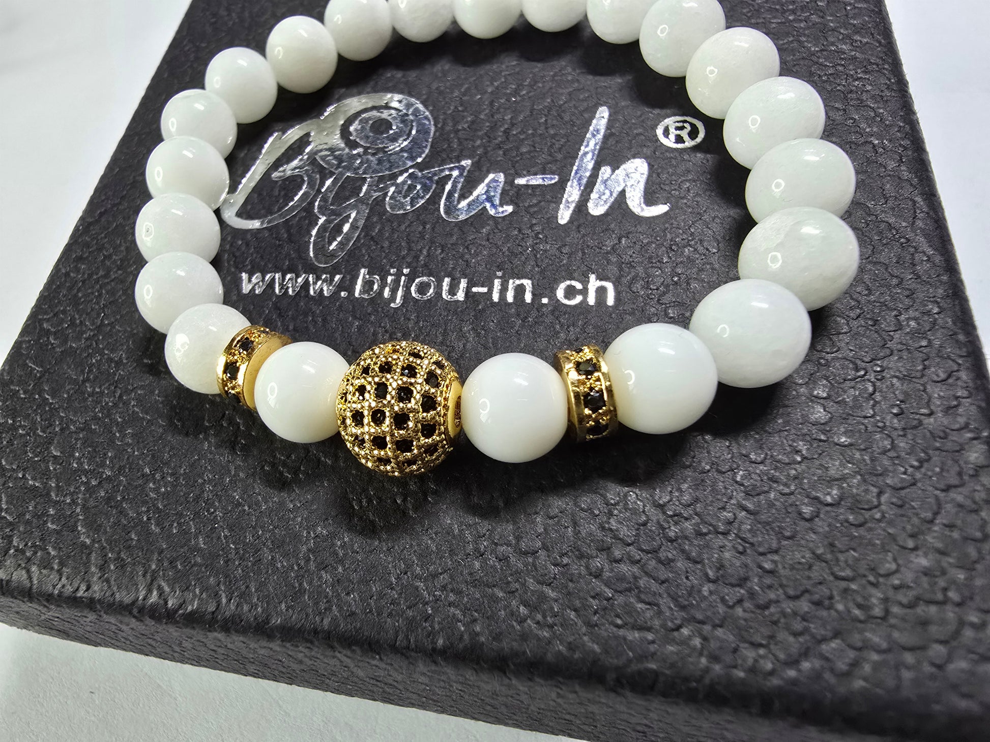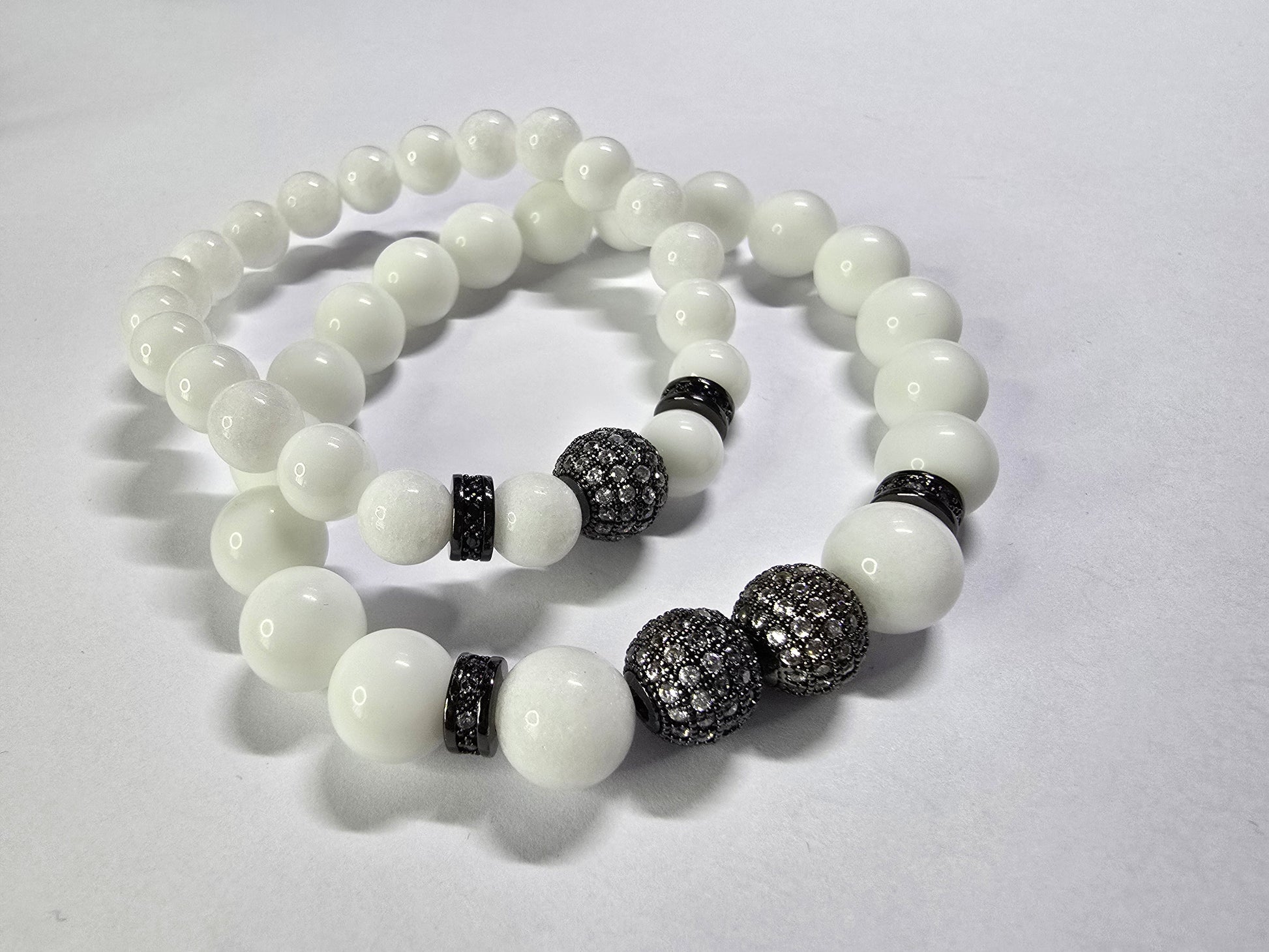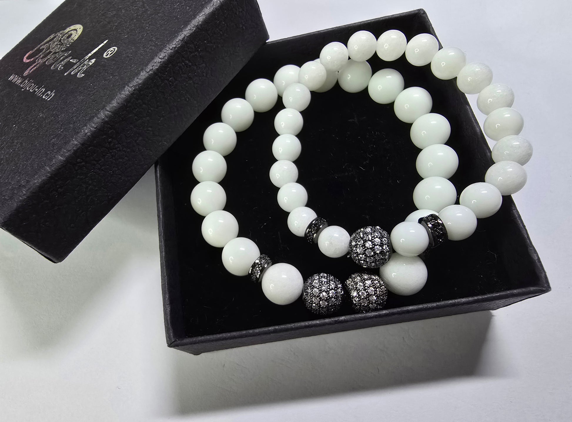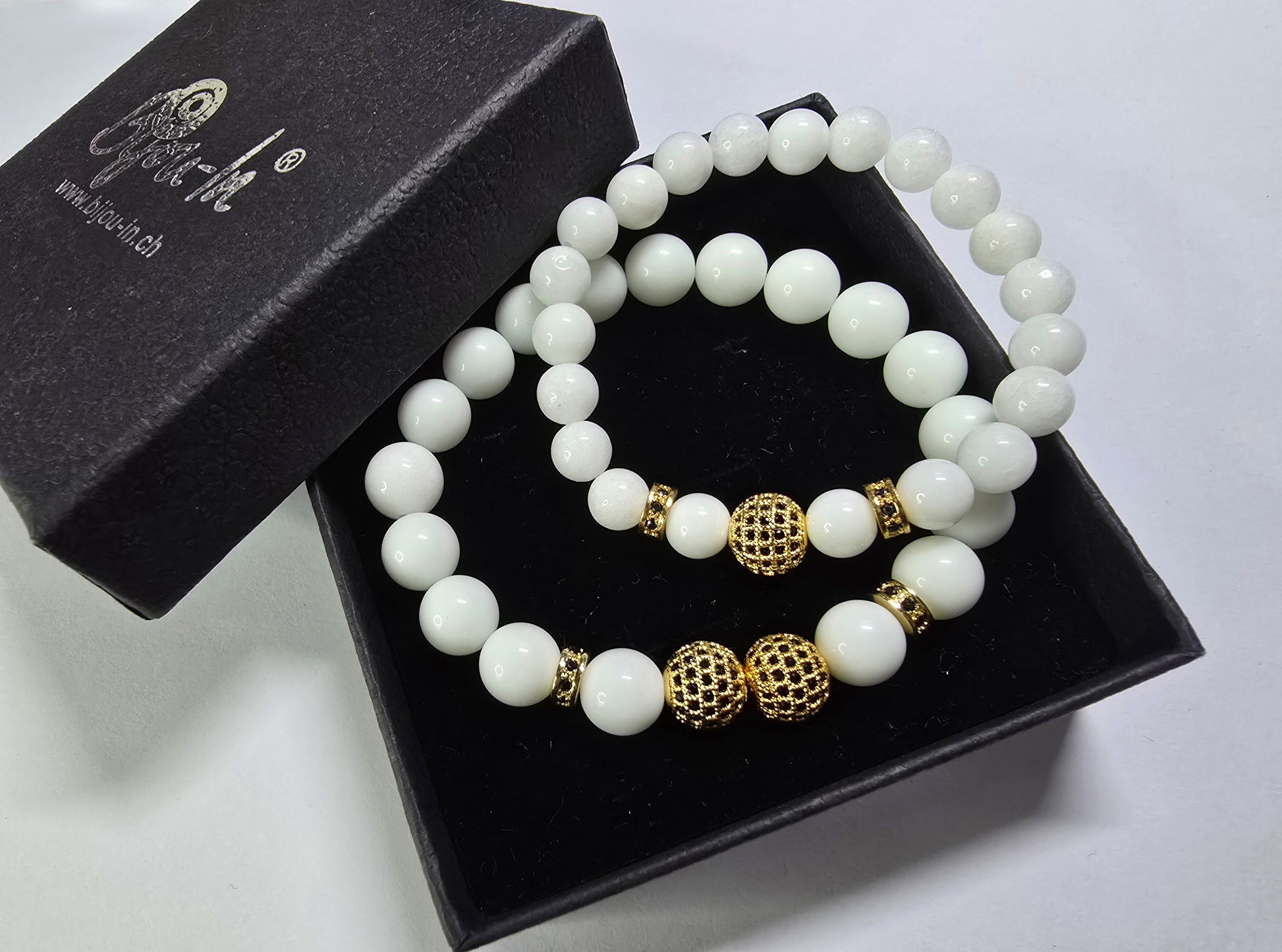 Partnerkette mit weissem Jade-Stein. Ein elegantes Accessoire für beide, zu jedem Outfit. Die mit Zirkonen besetzten Charms in Gold oder Schwarz, sorgen für ein dezentes funkeln und ziehen somit die Blicke auf sich.