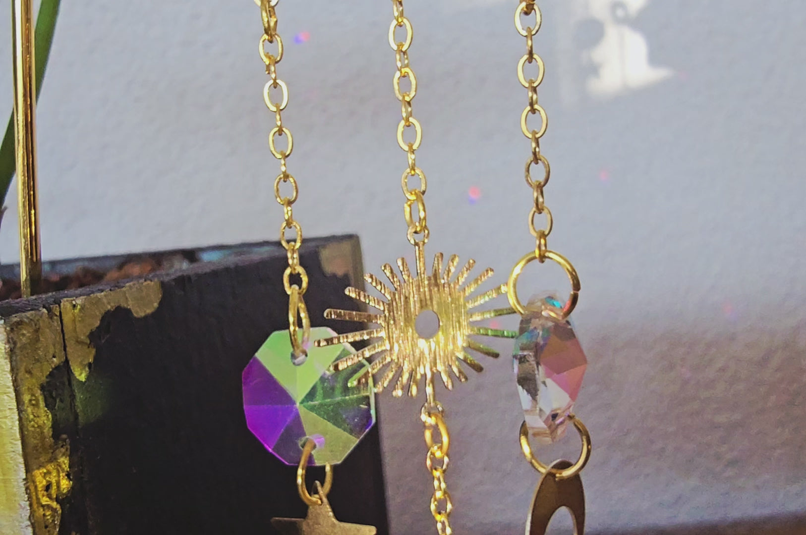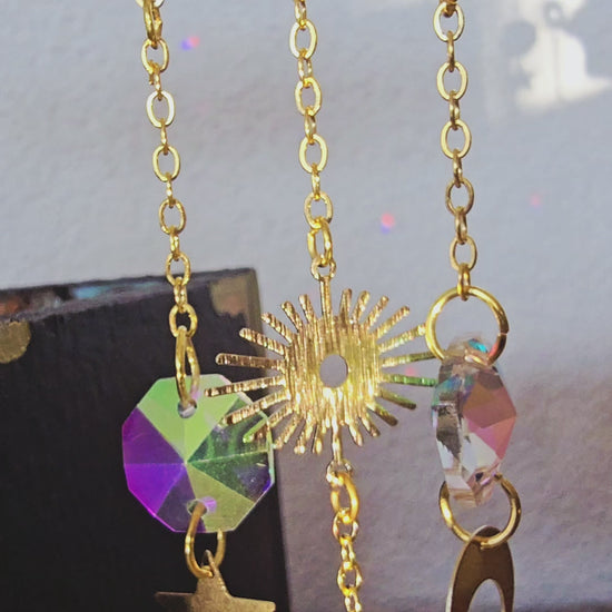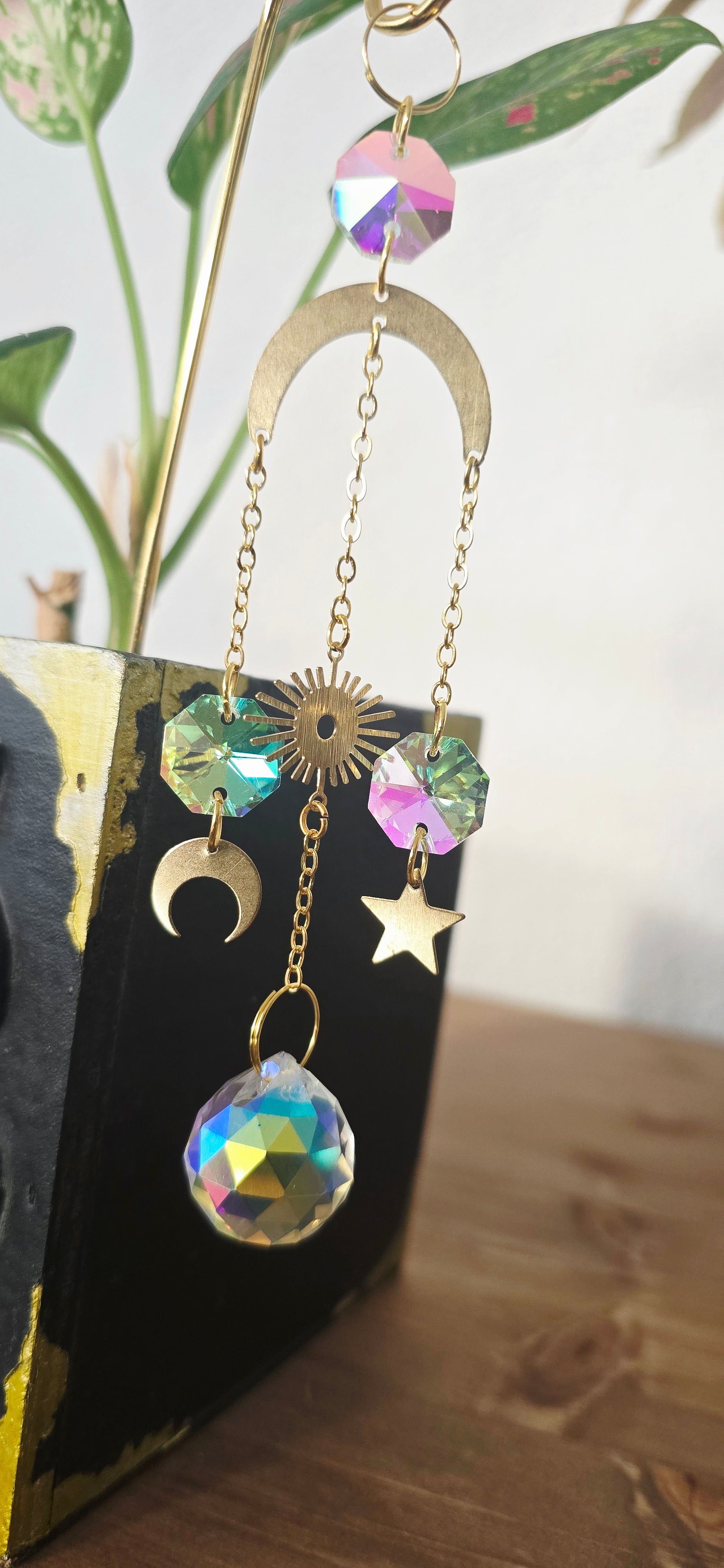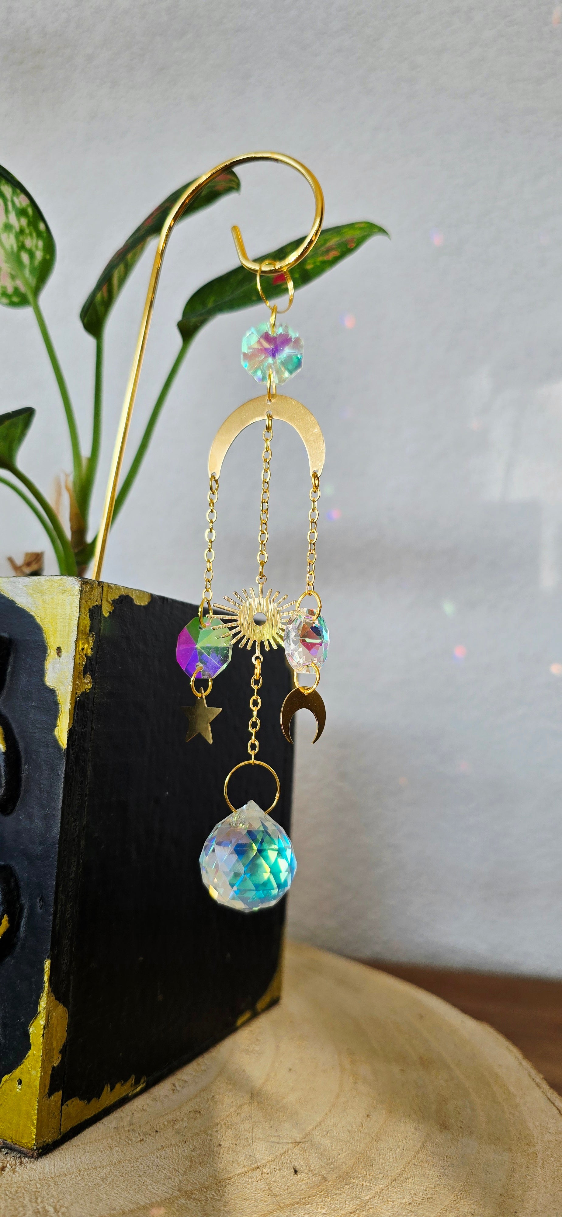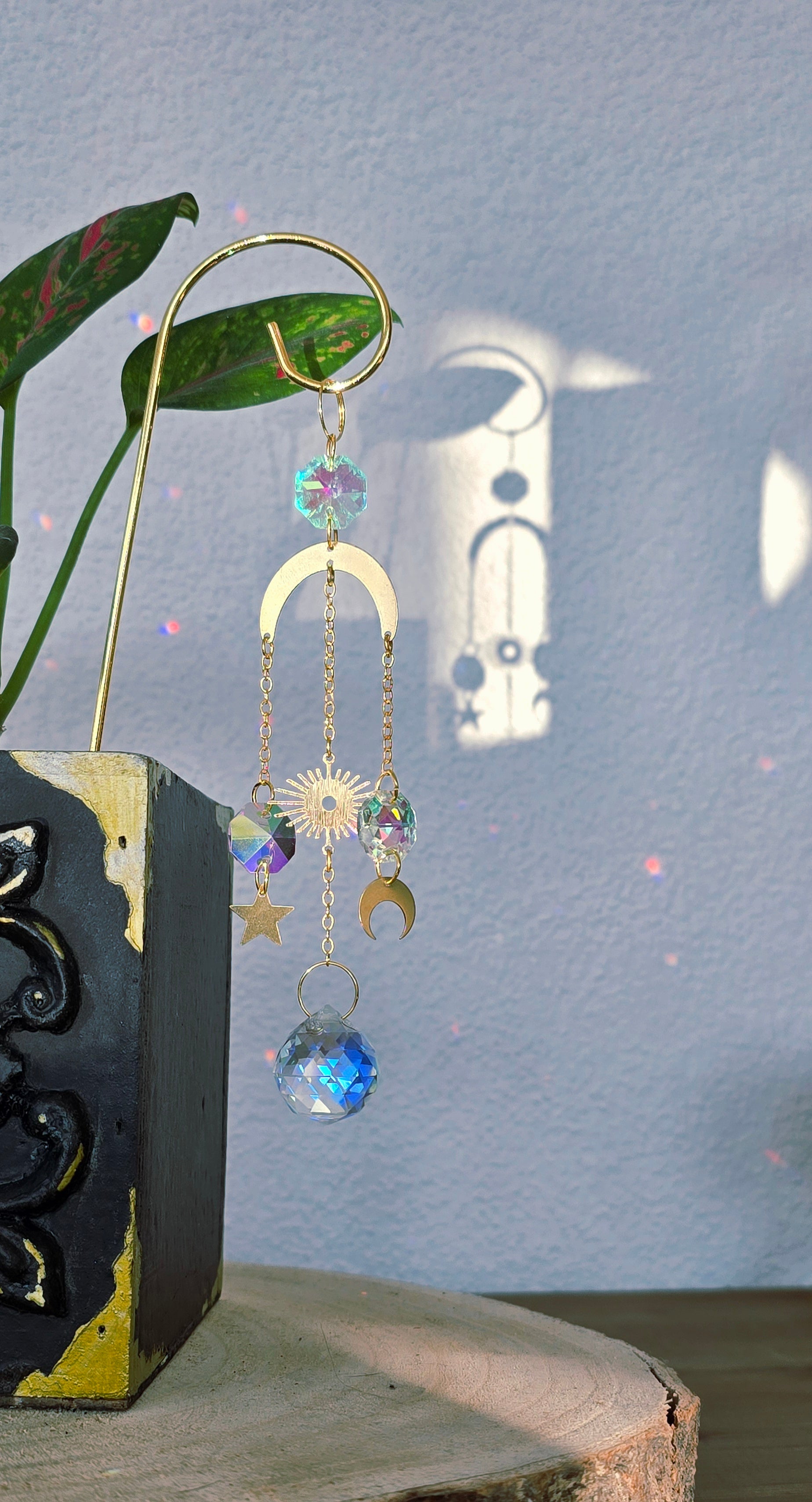 Funkelnde Kristalle fangen das Licht ein und verteilen sanfte Reflexionen im Raum. Stern, Mond und Sonne vereinen sich zu einem kleinen Himmelszauber, der deine Pflanzen umgibt und eine ruhige, verträumte Atmosphäre voller Licht und Harmonie schafft.